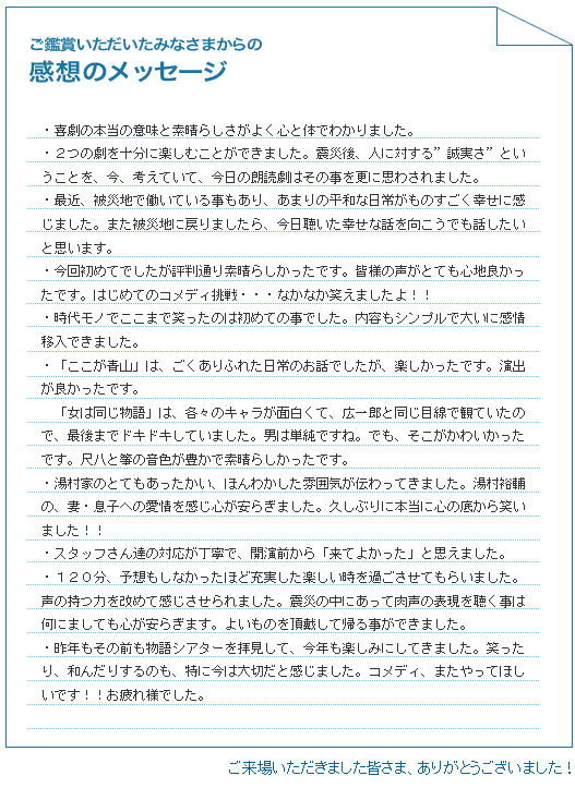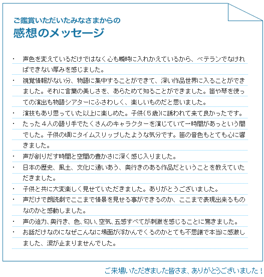 - すばらしい朗読劇でした。ぜひ原作を買って読みたいと思います。ぜひ再演をお願いいたします。