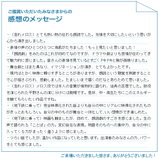 - 朗読と言っていいのか、映画と言っていいのか、ミュージカルと言っていいのか、そういった枠を超えて、言葉に出来ないくらい感動しました。