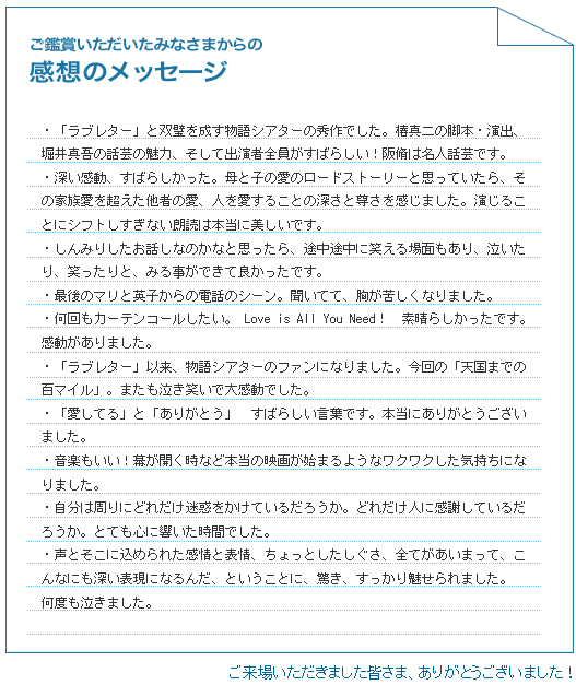 - 小学生の頃から手紙での交流が多かった私にとって、この公演ははずすわけにはいきませんでした。涙々でもう大変・・・。私はこの作品を若い方たちに観せたくなりました。自分の命を大切にしたくなるのではないでしょうか。